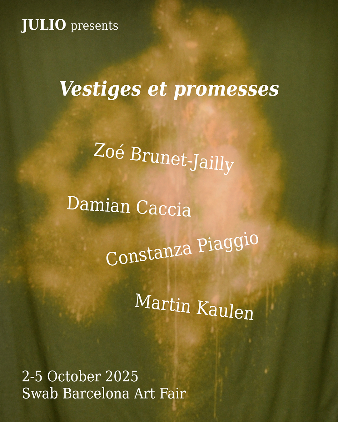 Julio participates in the Swab Art Fair Barcelona Solo Program with the support of Fundació Vila Casas, presenting the artists Zoé Brunet-Jailly, Damian Caccia, Constanza Piaggio, and Martin Kaulen.
