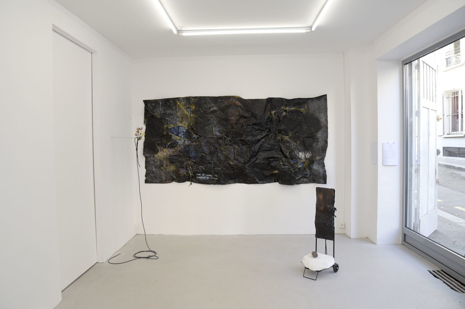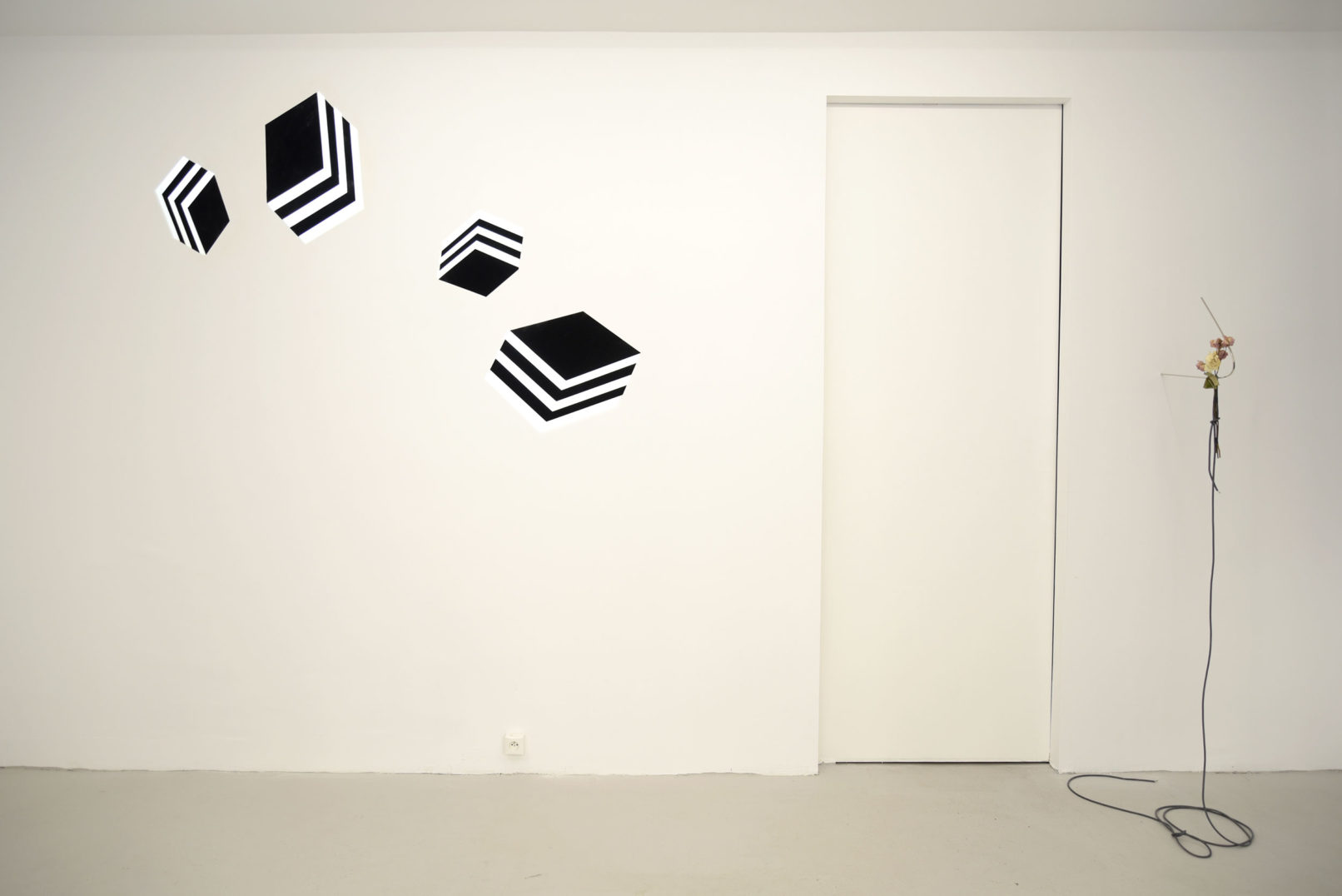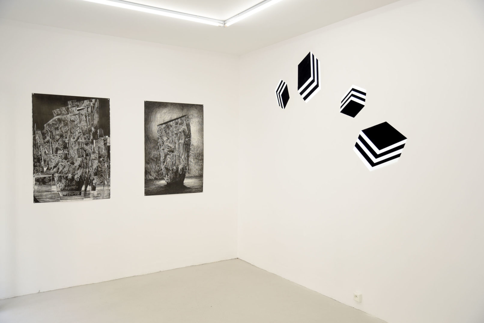 Dans les œuvres de Bianca Bondi, de Matias Ercole et de Gladys Nistor, le noir habite une surface considérée comme limite entre deux espaces: l’air et la profondeur, l’oeil et le mur, la lumière et l’ombre.Cette surface noire est éraflée pour laisser voir le blanc qui va construire l’image. Elle est trouée, soulevée comme une peau pour dévoiler une richesse souterraine. Elle est intensément noire jusqu’à se détacher du mur.