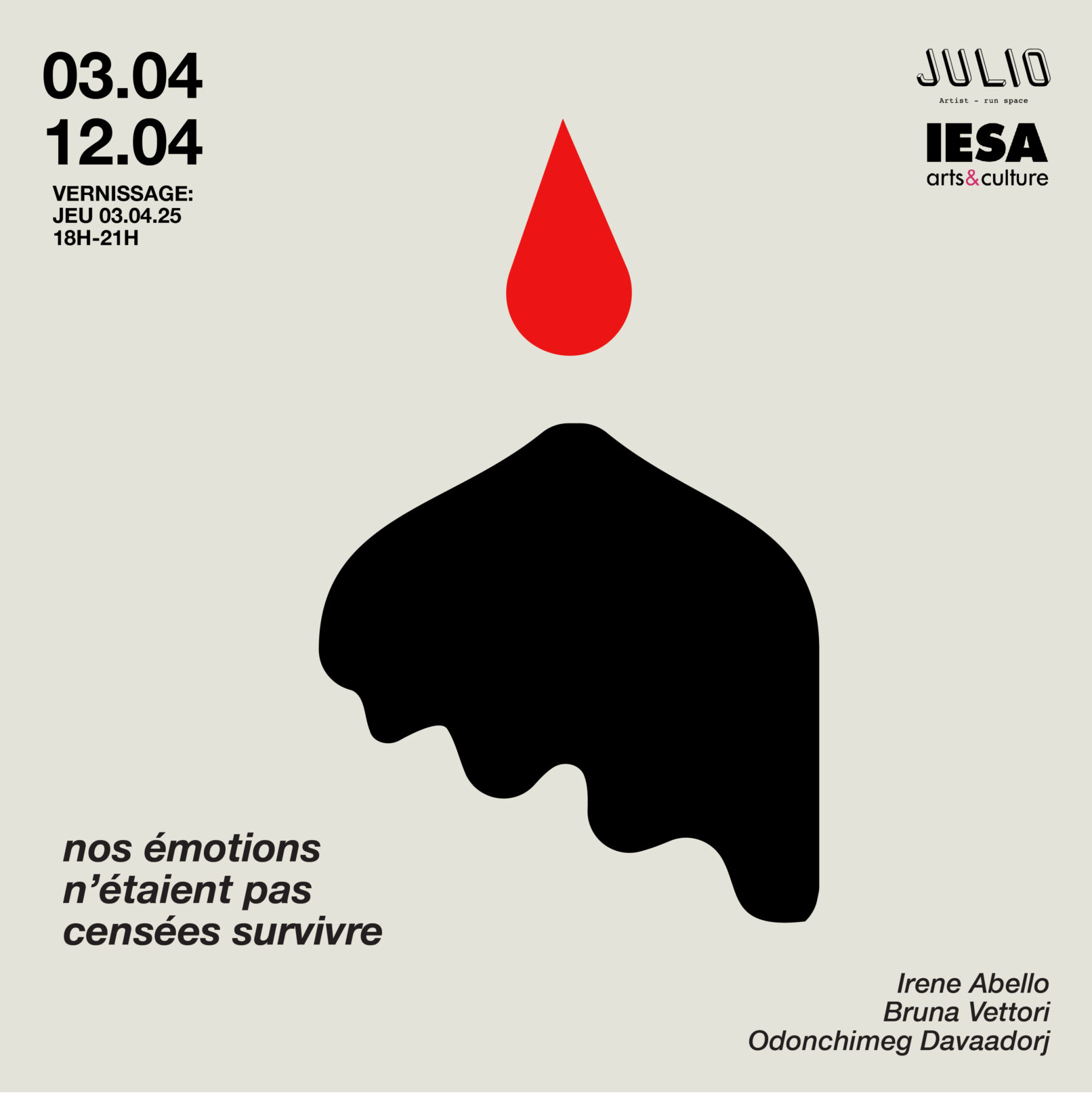 Julio et l’IESA Arts & Culture présentent Nos émotions n’étaient pas censées survivre , avec les œuvres des artistes ; Irene Abello, Odonchimeg Davaadorj et Bruna Vettori.